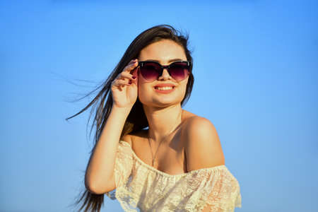 Beautiful woman on sunny day blue sky. Female power. Summer fashion. Find inner strength