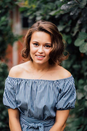Portrait of a young caucasian woman posing facing the camera outdoors