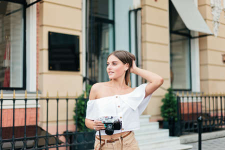 Cheerful blond woman holding retro camera in the urban environment