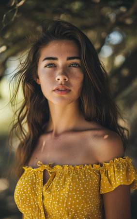 Close up portrait of a beautiful young woman in yellow dress posing in the forest
