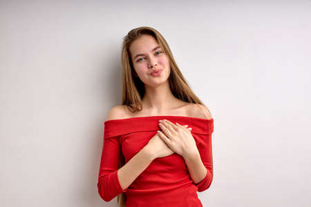 Cute pretty caucasian teen girl expressing gratitude, holding hands on chest, thankful for something, nice lady in casual red shirt look at camera, isolated on white studio background, copy space