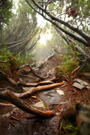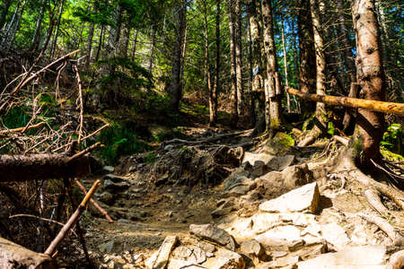 Hiking, view of mountain forest trail. Sunlights over a difficult trail in forest