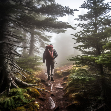 A lone hiker navigates a misty forest trail, surrounded by lush greenery and towering trees, embodying a sense of adventure and tranquility in nature.