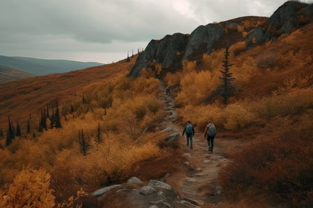 two people walking on a trail in the mountains with trees turning to orange and yellow leaves during an autumn storm