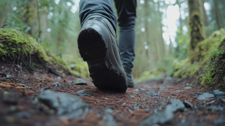 A hiker is seen walking along a narrow forest trail, surrounded by tall trees and dense underbrush. Sunlight filters through the leaves, creating a serene atmosphere