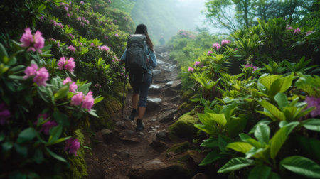 A person walks along a rugged path surrounded by vibrant wildflowers and dense greenery. The trail meanders through a tranquil landscape providing an escape into nature