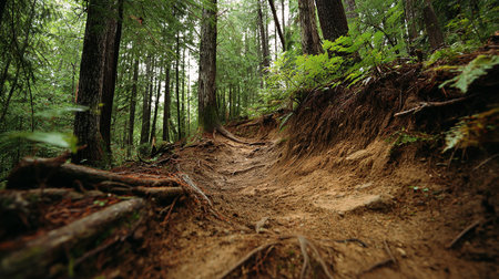 Forest biking trail with moss-covered trees and roots crisscrossing the path