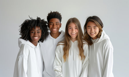 Group of happy interracial teenage schoolboys and girls in mock-up sweatshirts on white background