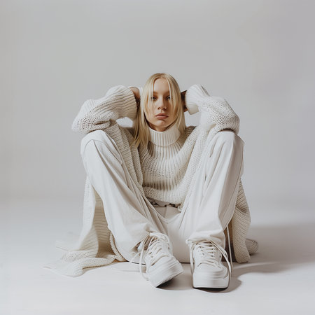 A woman is posing in a minimalist room. She is sitting on the floor. She has short hair and wears a white sweater. Natural light fills the space, highlighting her look.
