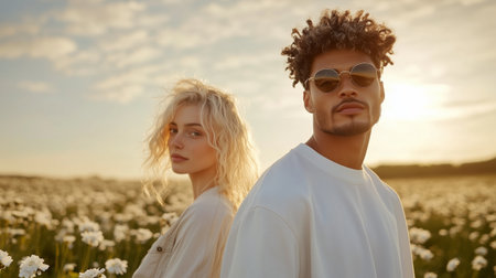 Couple standing in a field of flowers during sunset with a bright sky and soft clouds