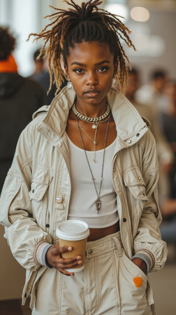 A young woman with dreadlocks wearing a white top and beige jacket, holding a coffee cup, looking to the side