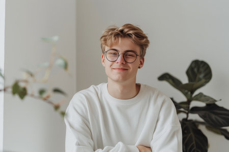 Portrait of a Confident Young Man with Glasses and a White Sweatshirt, Smiling at Home