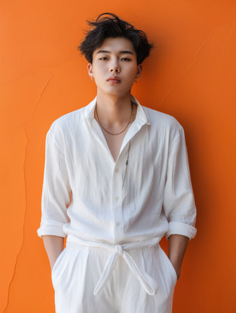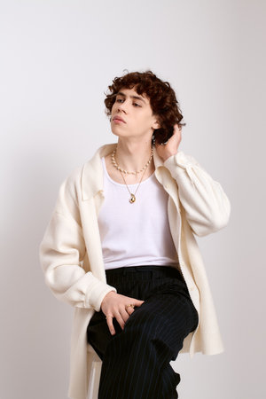 Handsome young man poses thoughtfully in a chic outfit against a simple background.