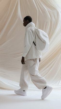 A model in stylish white jacket poses confidently in modern setting