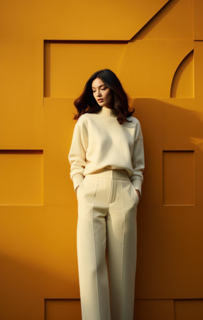 knitted sweater with long horn pants brown woman in yellow jacket on a wall