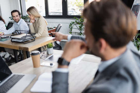 Group of multiracial colleagues working at the office. Coworkers standing on the background.