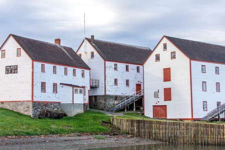Louisbourg, Canada - September 20, 2018: Historic buildings in the fortress of Louisbourg, with visitors, Cape Breton island, Nova Scotia, Canada