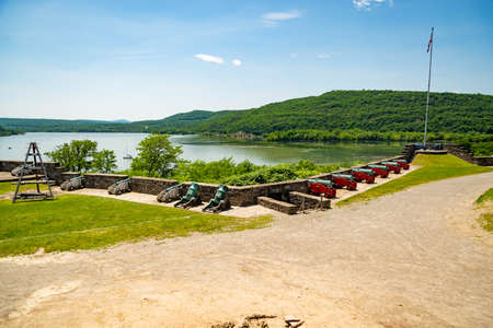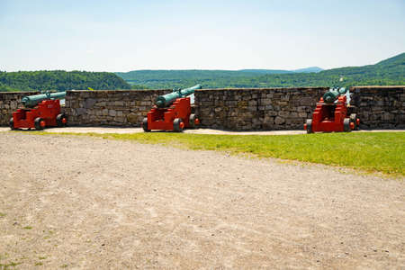 Row of cannons at the historic Fort Ticonderoga in Upstate New York. Fort Ticonderoga, formerly Fort Carillon, is a large 18th-century star fort built by the French in northern New York, United States
