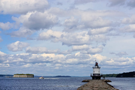 South Portland, Maine, USA: Spring Point Ledge Light, 1897, and Fort Gorges, 1864, under dramatic cloud formations in Casco Bay, Maine.