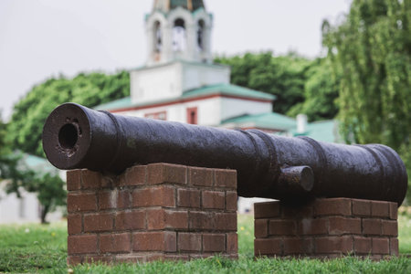 Moscow, Kolomenskoye. A fortress cannon that participated in the Battle of Poltava in 1709 against the background of the front gate in the park.