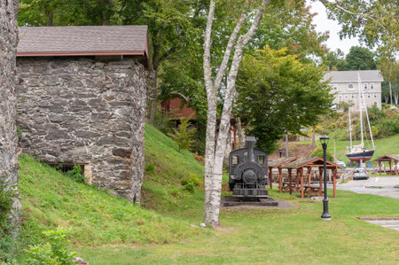 Rockport, Maine, USA - September 19, 2018: Vulcan steam locomotive and lime kilns displayed in Rockport Marine Park, which was a lime processing site in the 1890s