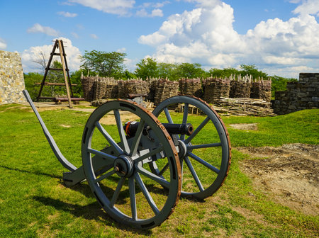 FORT TICONDEROGA, NEW YORK STATE - JUNE 23, 2019: Young men dressed as soldiers, demonstrating how guns were used in fighting the wars that shaped America.