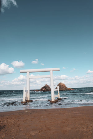 Sacred Meotoiwa Rocks and Ocean View with Japanese Shinto Torii Gate on the Beach