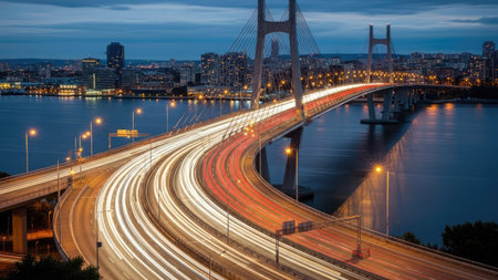 Cars drive across a multi-lane highway bridge with a city skyline in the distance Clear details a...