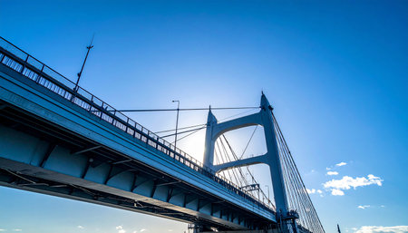 cable-stayed bridge close-up, main tower and cable against a blue sky