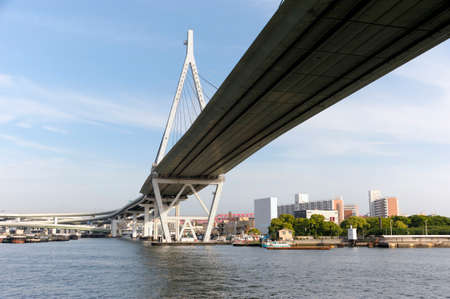 Large silver bridge over Okawa River in Osaka