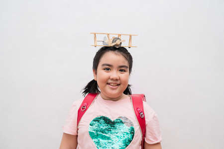 cute girl carrying school bag going to school, happy playing toy plane on gray wall background Freedom to dream