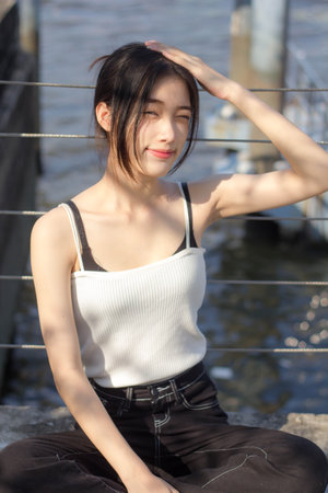 asia thai girl White dress beautiful girl smile and relax
