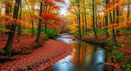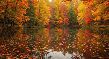 Tranquil autumn forest reflects vibrant colors of nature beauty generated by artificial intelligence