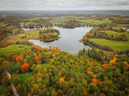 Aerial view of autumn forest and lake. Colorful trees in fall season.