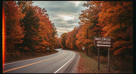 A serene country road lined with lush green trees and a classic red barn, evoking a peaceful rural lifestyle.. AI Generation