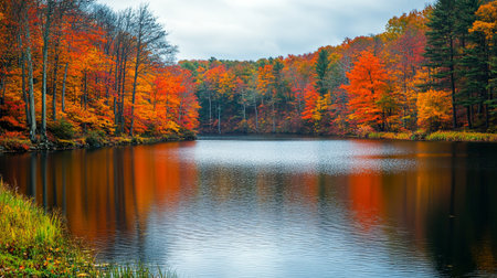 A serene autumn lake surrounded by vibrant foliage, captured during the golden hour. The image exudes peace and tranquility, perfect for nature and landscape photography. Ideal for use in commercial projects needing a calming natural backdrop.