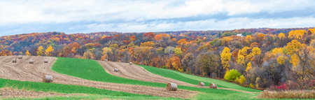 Rolling hills, autumn colored trees, plowed corn and stripes of green alfalfa are the setting for multiple bales of hay.