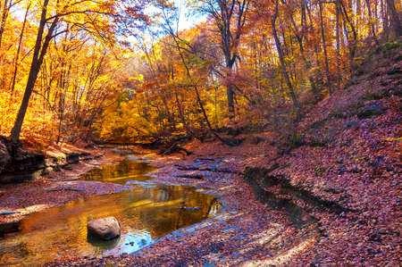 A woodland creek meanders in a shady ravine under brilliantly lit autumn trees