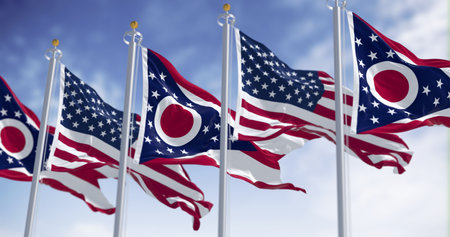 Ohio state flags waving in the wind with the national US flag on a clear day. 3D illustration render. Rippled fabric. Selective focus