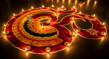 Indian festival Diwali, Diwali oil lamps lit on colorful rangoli. Hindu traditional.