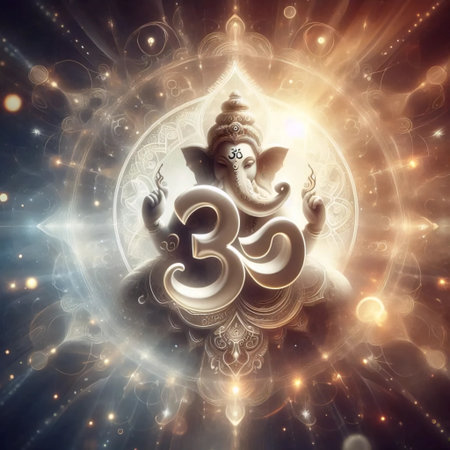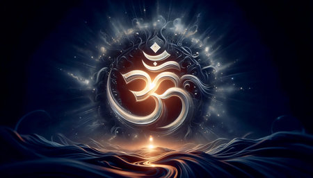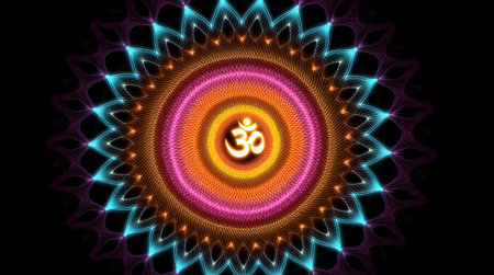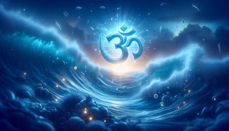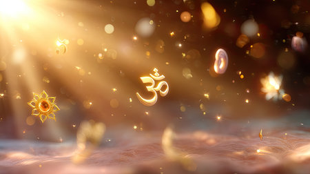 This captivating image features glowing Om symbols surrounded by vibrant light effects and sparkling particles, embodying spirituality and peace.