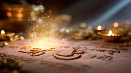 A serene and enchanting scene featuring a glowing spiritual symbol on sacred paper, surrounded by soft lights and glowing particles, perfect for celebrating festivals.