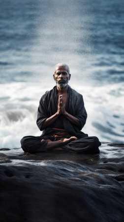 A man with curly hair and a beard is meditating peacefully by the ocean. Waves crash softly against the shore while the sun shines creating a tranquil atmosphere.