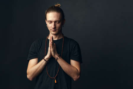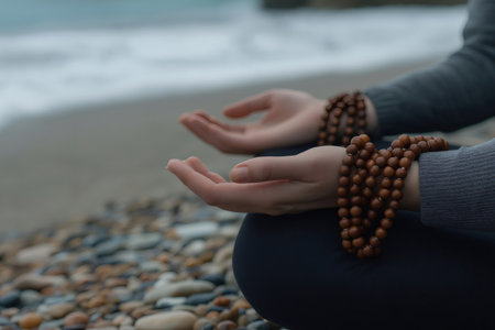 Woman practicing meditation on a pebble beach, holding wooden prayer beads and assuming the lotus position