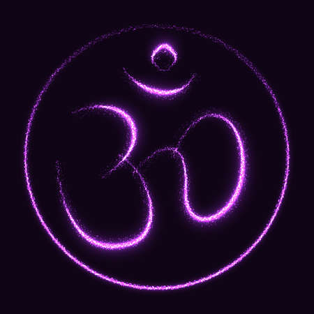 Om symbol icon with glow and glitter in purple color on dark background. Vector illustration.
