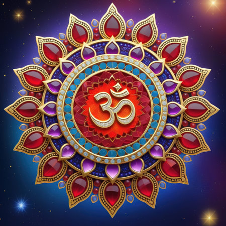 This captivating image features an elegant Om symbol surrounded by a vibrant gemstone mandala, combining intricate details and rich colors to evoke spirituality and harmony.