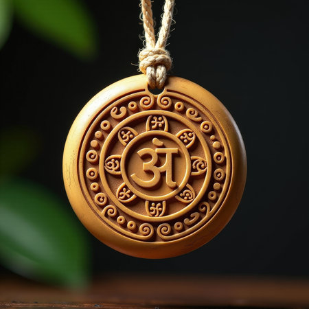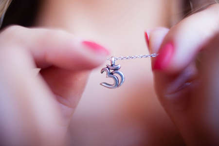 selective focus and close up of Hindu om symbol made out of metal, Hanging on the tent during a spiritual gathering with copy space