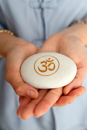 Hands holding The Om or Aum symbol of Hinduism and Buddhism on a white stone.