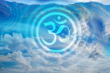 Symbol of mantra OM on sky background. OM logo as symbol of meditation or yoga. OM symbol as metaphor for Buddhism in Hinduism. Meditation in Buddhist Culture. Meditation and Yoga Practices