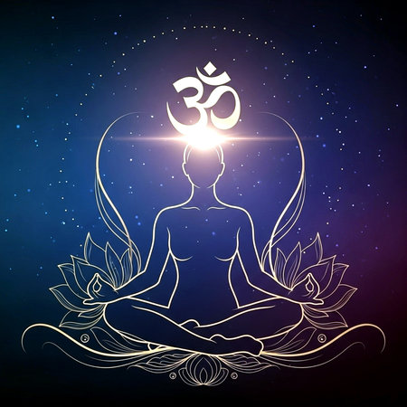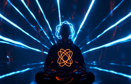 A meditating figure is immersed in a tranquil setting with a glowing atom symbol illuminating their center, radiating energy lines around.